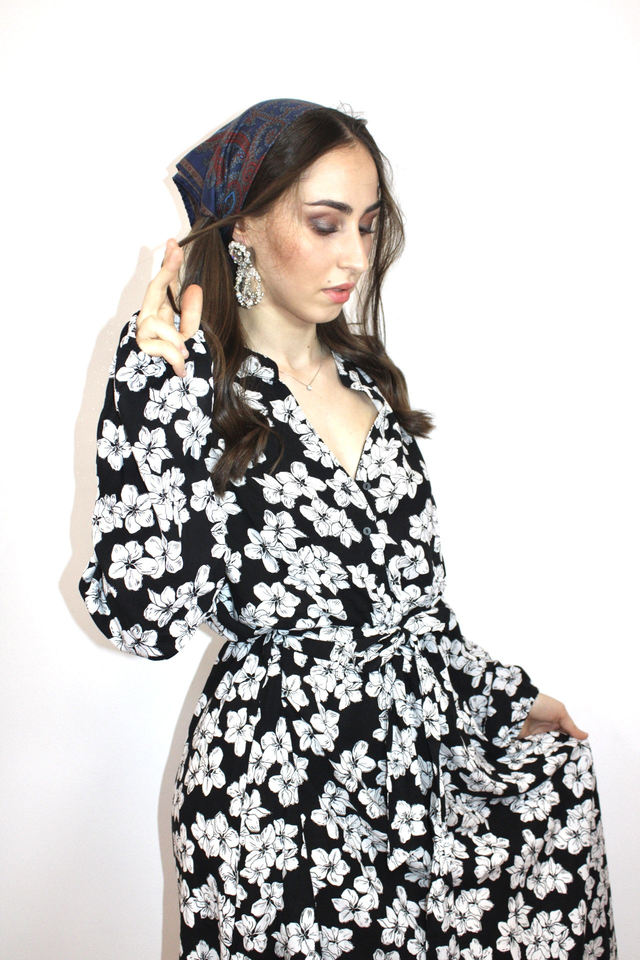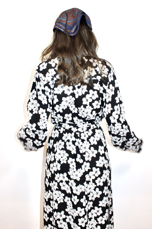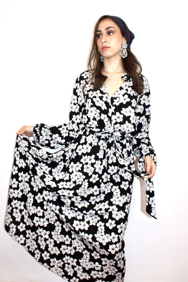 Abito lungo fantasia fiori bianco e nero