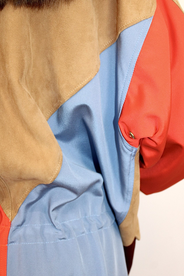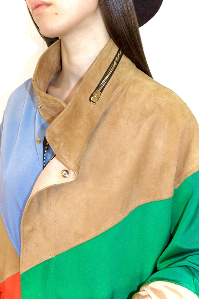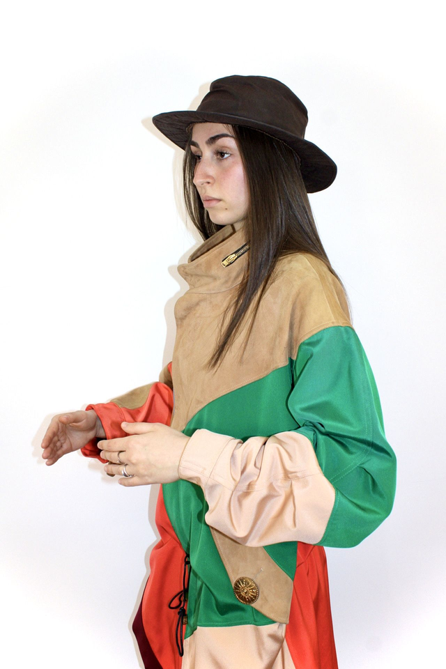 Splendido gubbino donna, modello parka, multicolor realizzato in cotone tecnico antigoccia ed aree in pelle di renna, linee ampie, collo alto, chiusura nascosta con zip, con elastico interno restringibile in vita.