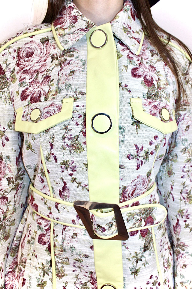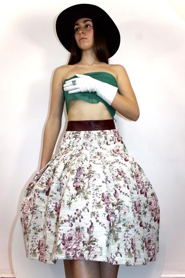 Il completo fantasia rose bordeaux è composto da una Gonna Svasata a vita alta con pieghe che si allarga ampio sul fondo, ed da una Giacca impreziosita da una cintura in vita e dettagli in pelle.