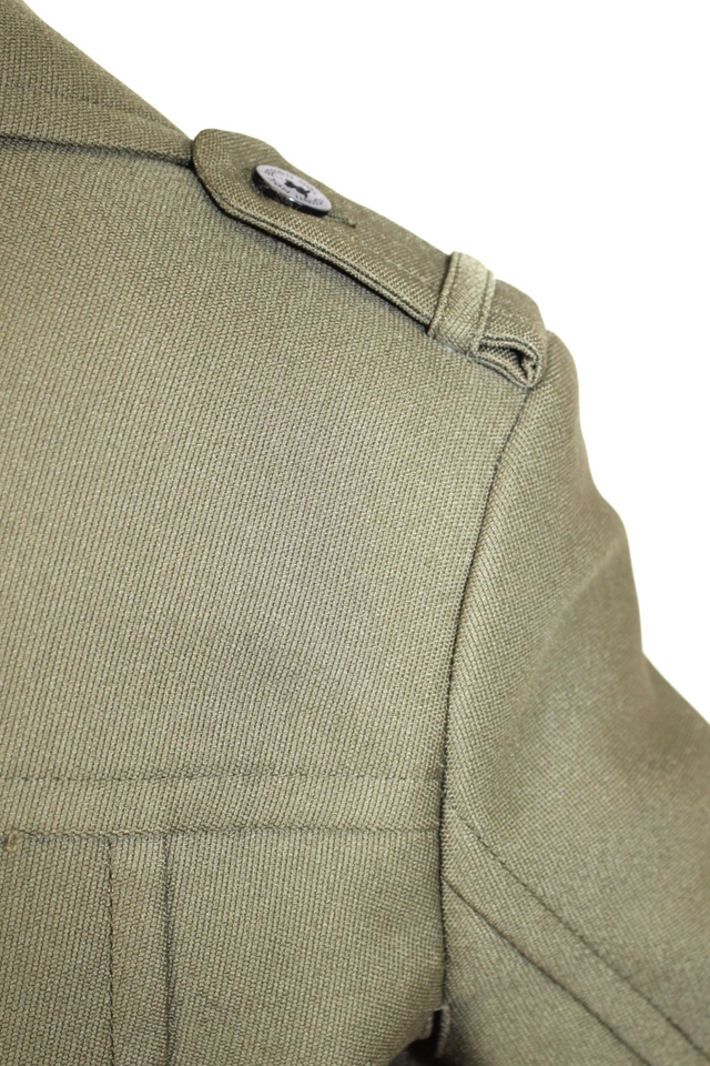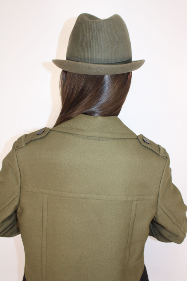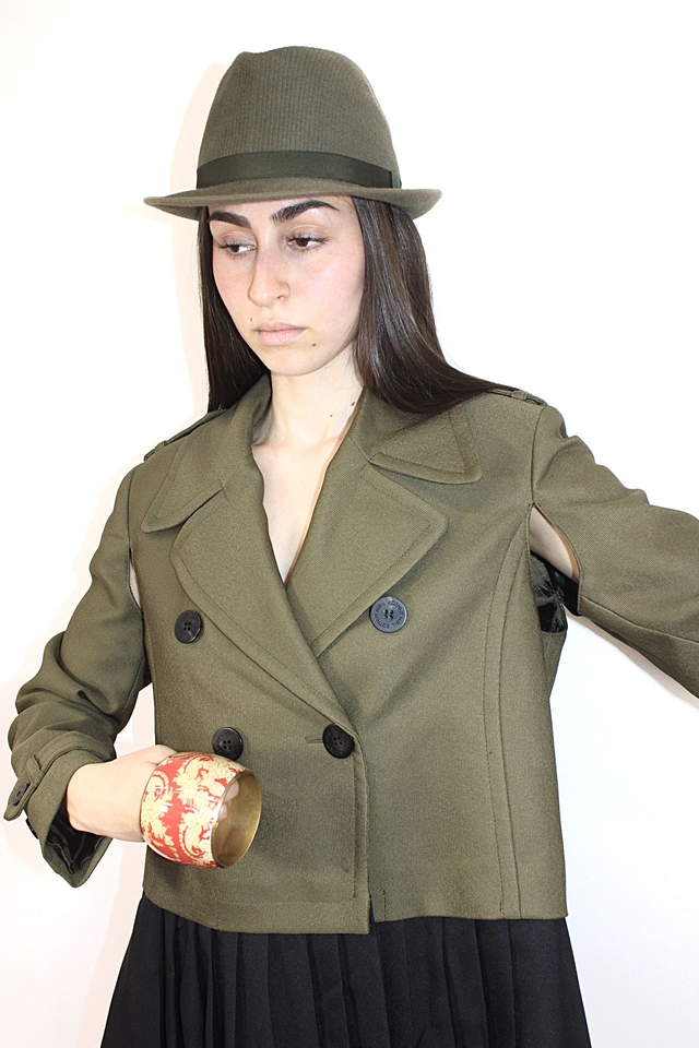 Il Trench color verde oliva & nero utilizzabile anche come abito, collo rever doppio petto con bottoni neri.
